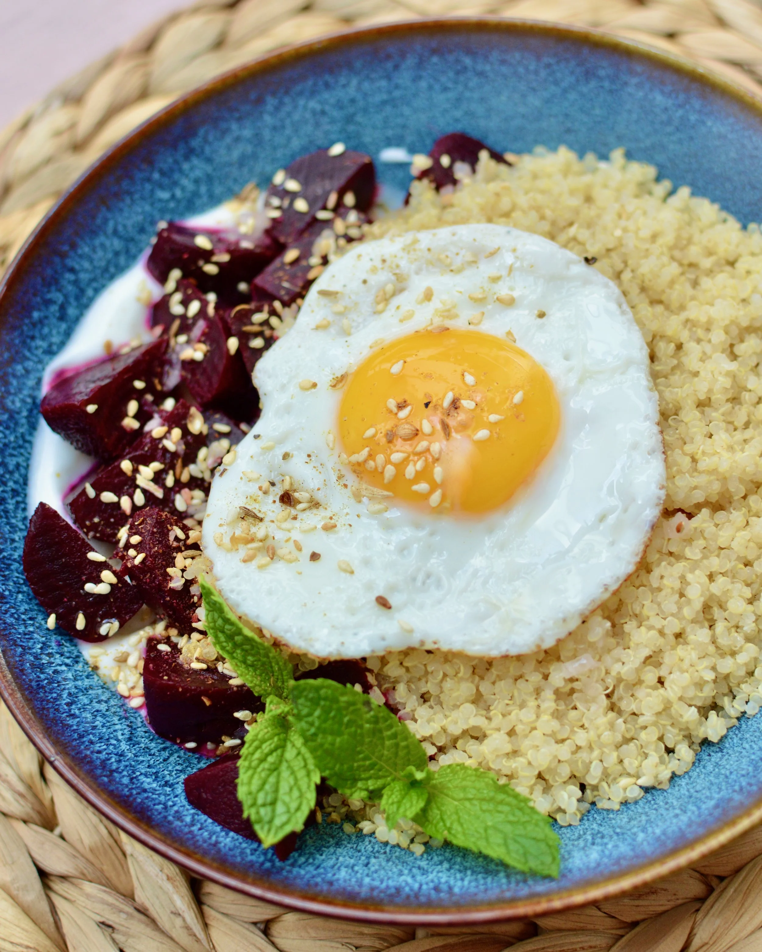 To prepare the bowls, drop a spoonful of yogurt and drag it across the side of the bowl. Add the beats to this side of the bowl. Fill the bowl with quinoa, top with an egg or two. Drizzle some olive oil (or a lemon vinaigrette) on top, sprinkle with dukkah, and garnish with mint.