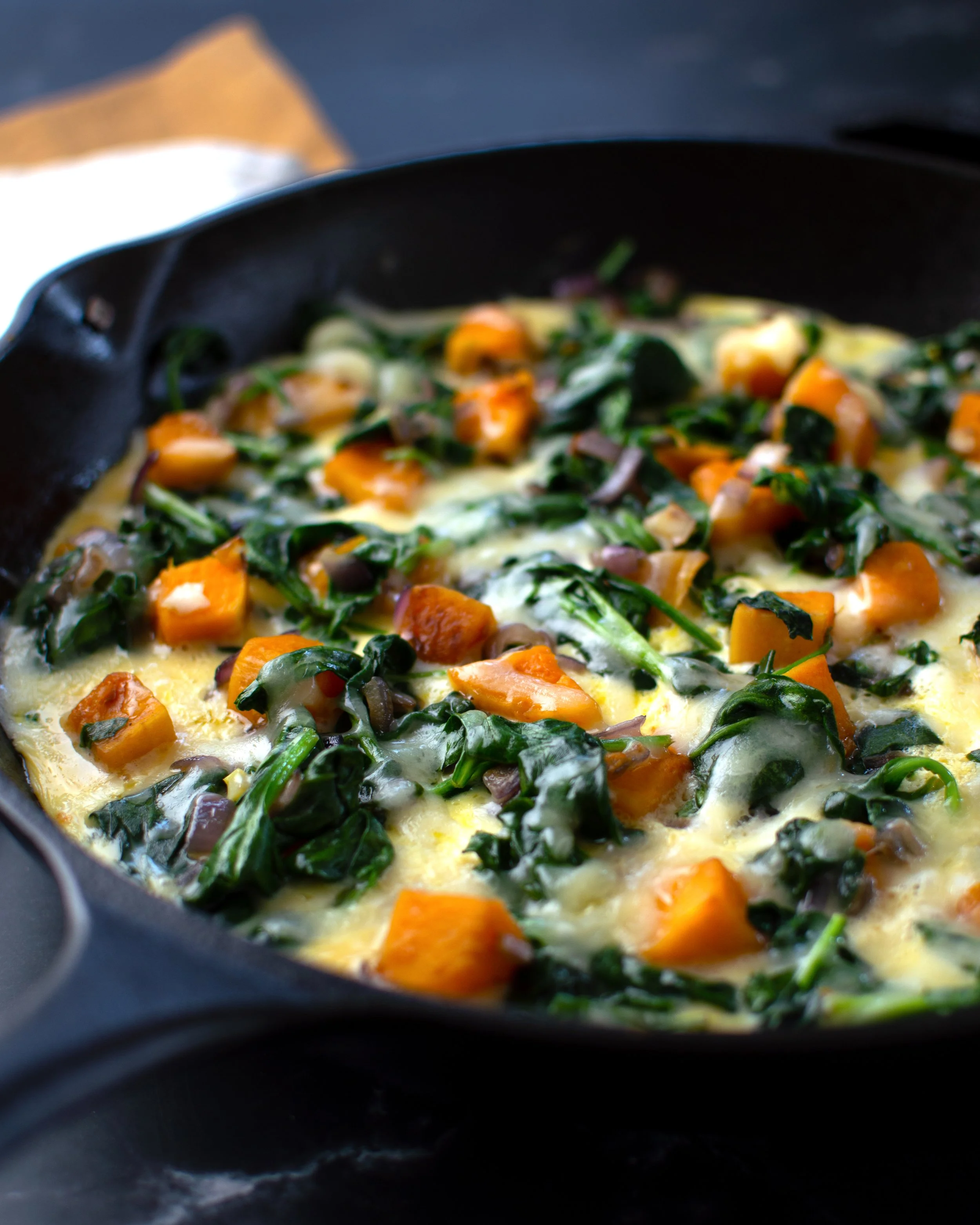 Whenever I put in the hard work of cutting up a butternut squash to use in a recipe, if there is any leftover, I will roast the rest to use in various other recipes. One day, I put some of the butternut in my eggs with some spinach and was surprised at how delicious it was - the sweet butternut plays so nicely with the savory cheese.