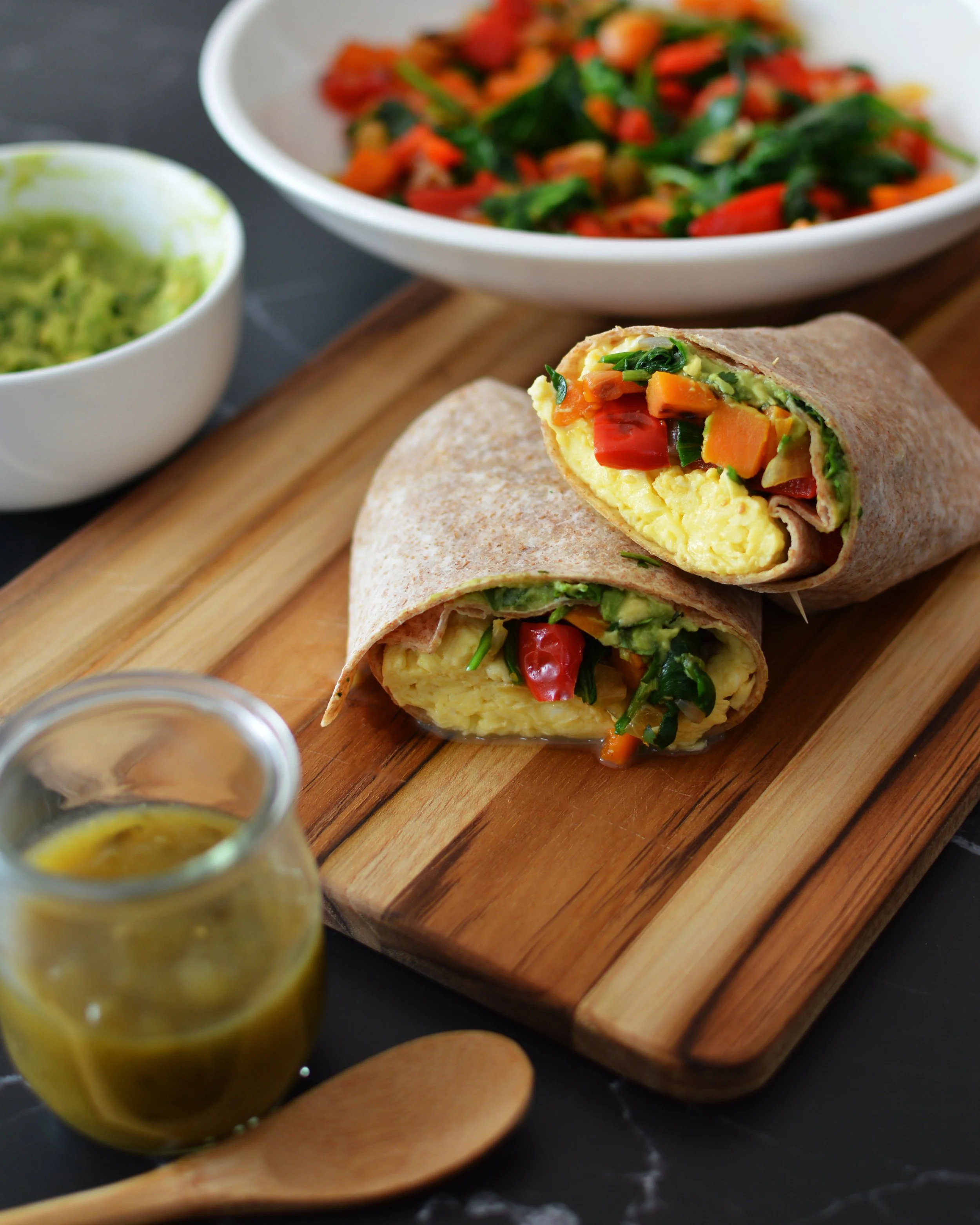 Meanwhile, gently warm up the tortillas, either in the oven or on a skillet for a few minutes. Assemble the tortillas, first adding the eggs to one half, then topping with vegetable mixture and any desired toppings such as guacamole and salsa. If you didn’t overstuff your tortilla, fold 2 sides in by an inch and then roll it up. Alternatively, if you overstuffed it fold it over in half.