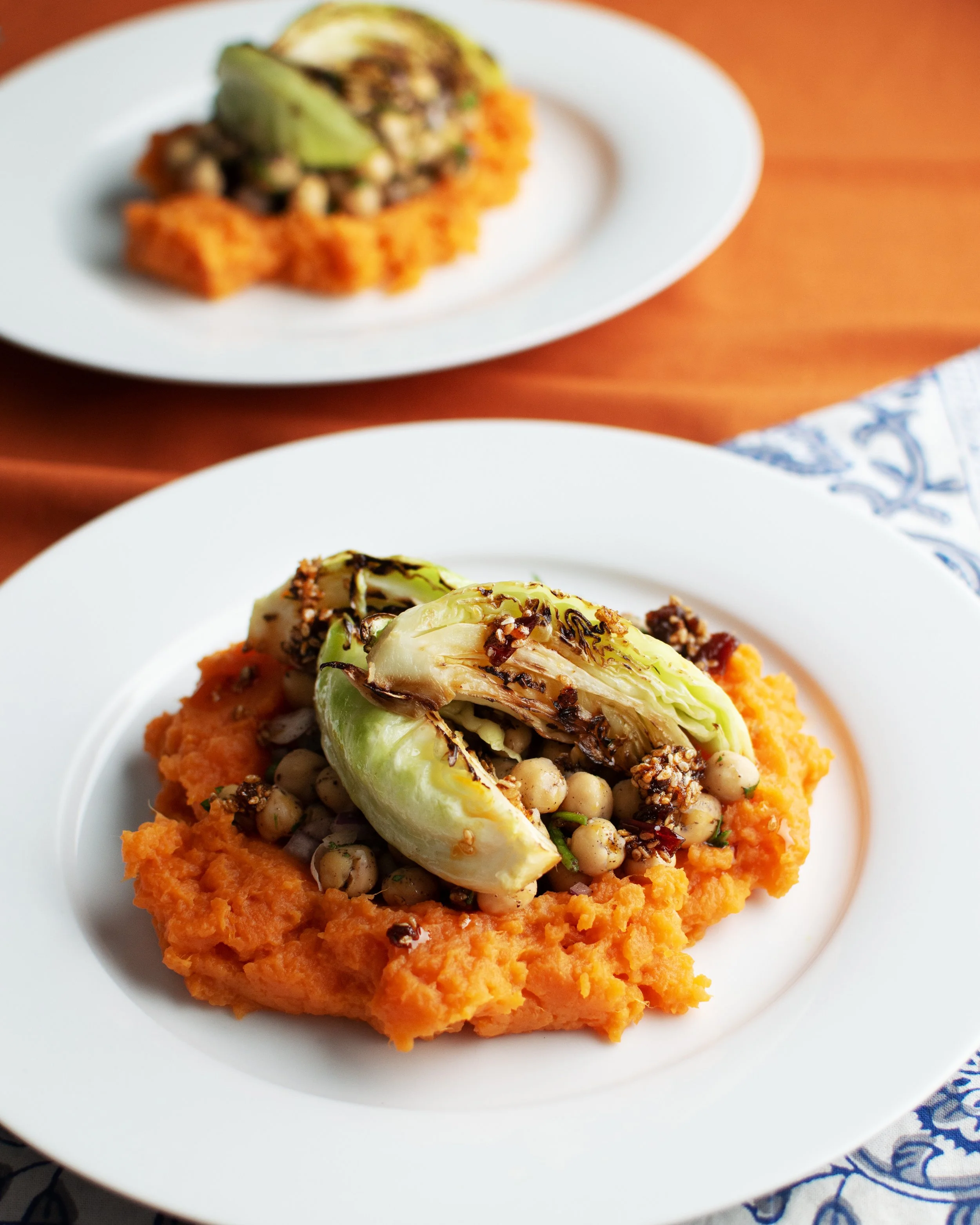 To plate, add a big spoon of sweet potato mash to a plate then using the base of the spoon press down in the center to make a nest. Add a few generous spoonfuls of chickpeas, top with some cabbage wedges, and a drizzle of harissa oil.
