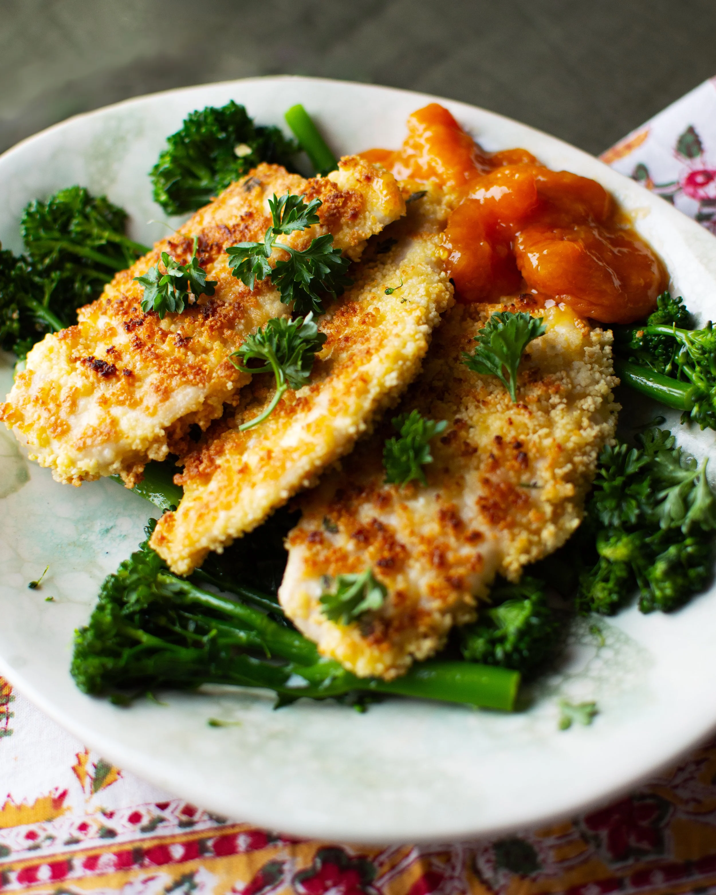 Crispy chicken is great, but crunchy chicken is even better! Just by pan-frying, you can achieve an insane crunch with every bite as the small beads of couscous crisp up. Served on a bed of garlic-infused broccolini and a jammy apricot sauce this is a well-balanced, colourful meal.