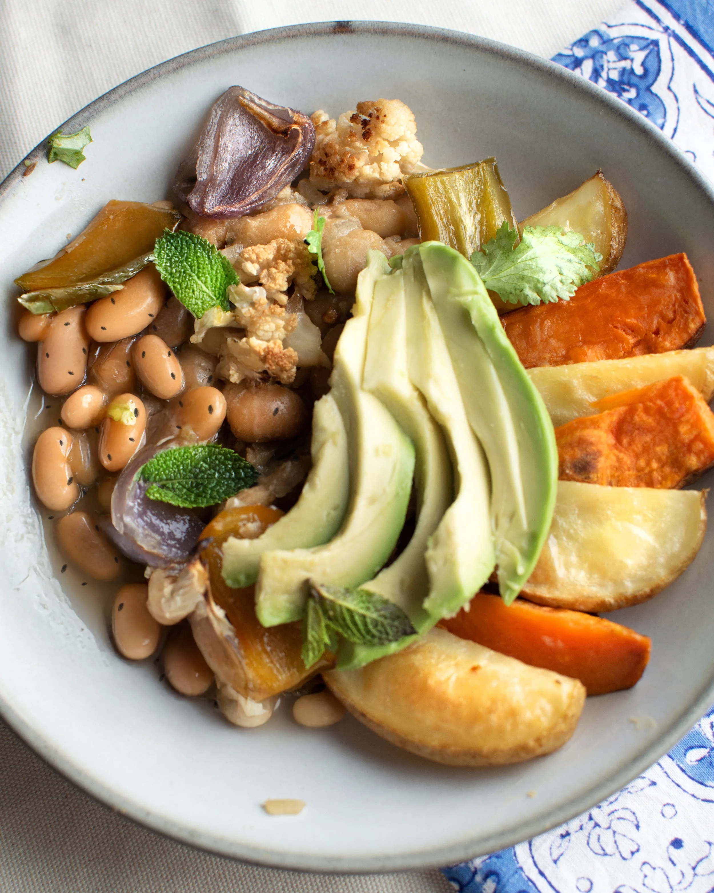 To serve, ladle the creamy beans into each bowl and top with the roasted vegetables, some fresh mint and cilantro, and avocado slices.