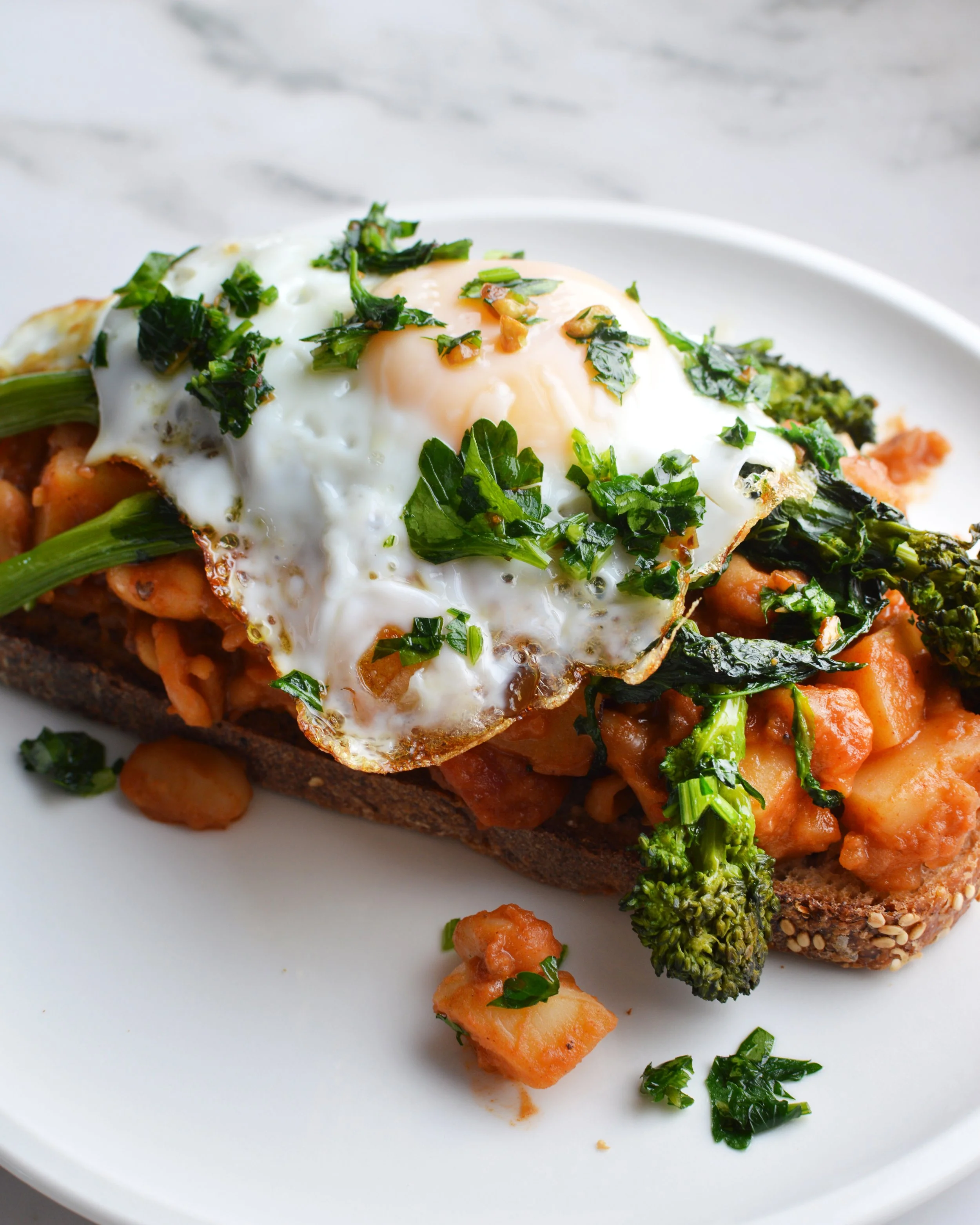Bunny Chow is an Indian South African fast food that consists of a hollowed-out loaf of bread filled with curry. My version is an open-faced sandwich and is adapted from Bryant Terry's Big Beans, Buns and Broccoli Rabe. This recipe has much of the original delicious flavours such as the berbere spiced beans and potatoes as well as the deliciously fresh persillade (a parsley and garlic sauce), but is far simpler with fewer steps and a shorter cooking time. The addition of an egg on top, not only lends more protein to the dish, but when you cut through the egg yolk, it soaks through the delicious curried potatoes and beans and adds another dimension to the dish.