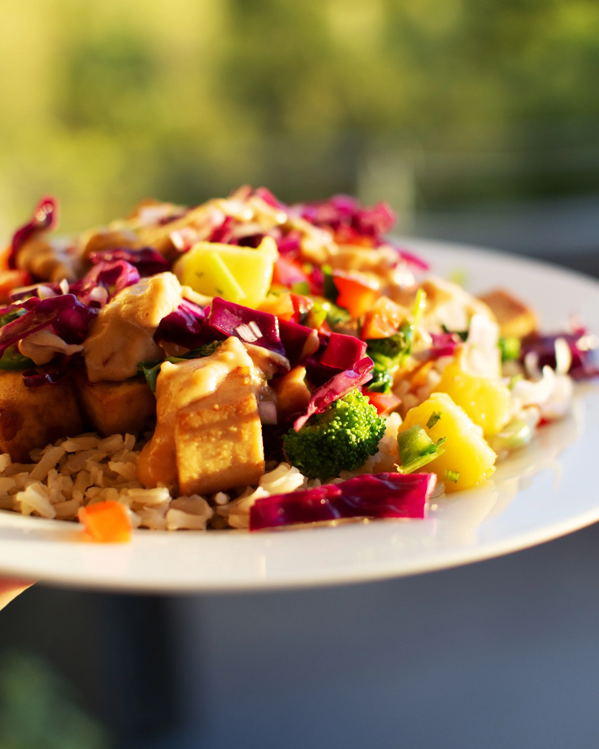 Rainbow Tofu Mango Bowls with Peanut Butter Sauce