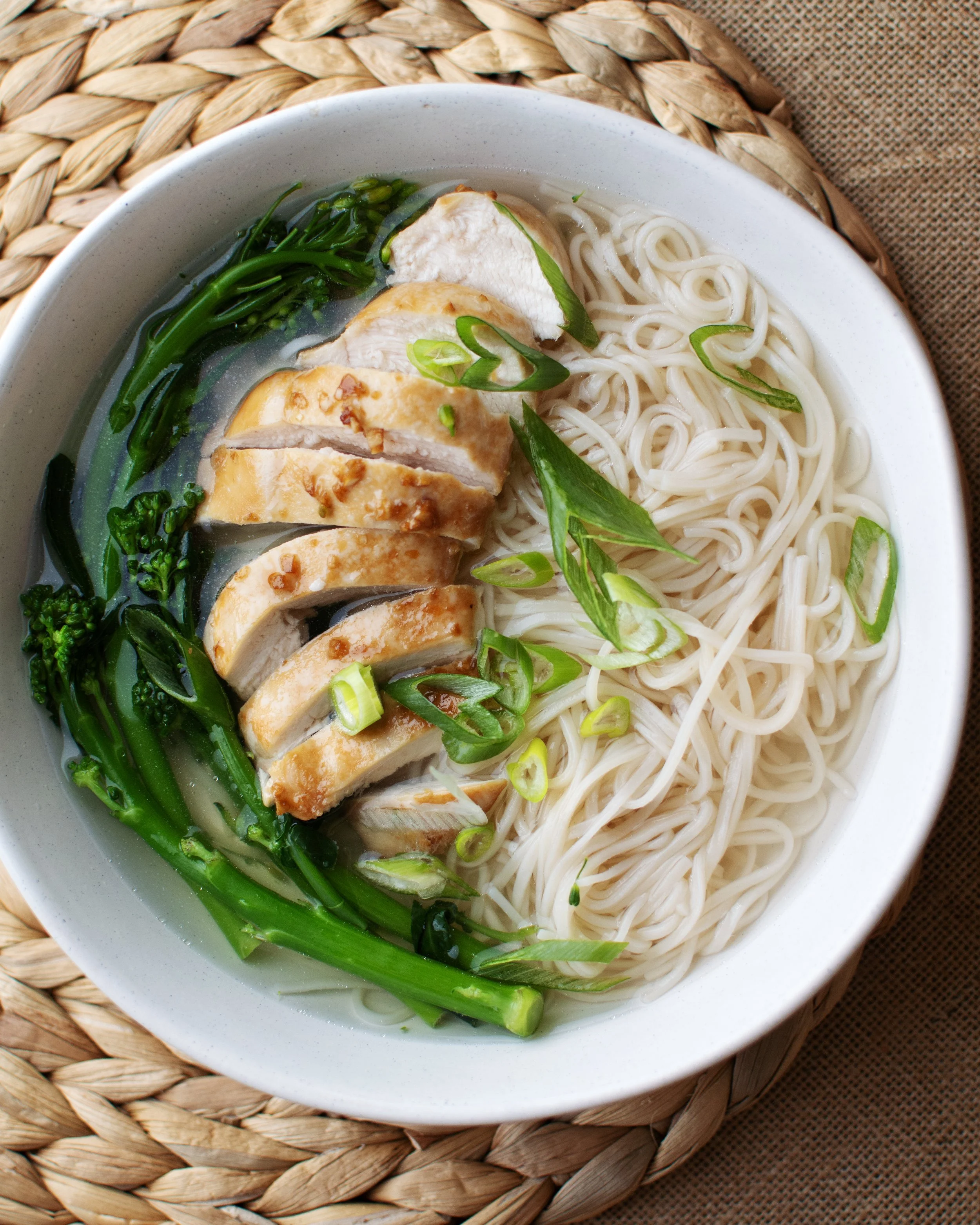 To assemble the bowls, add chicken stock, noodles, chicken slices, broccoli, and green onions. Serve with a squeeze of lime juice and freshly cut chilies (optionally).