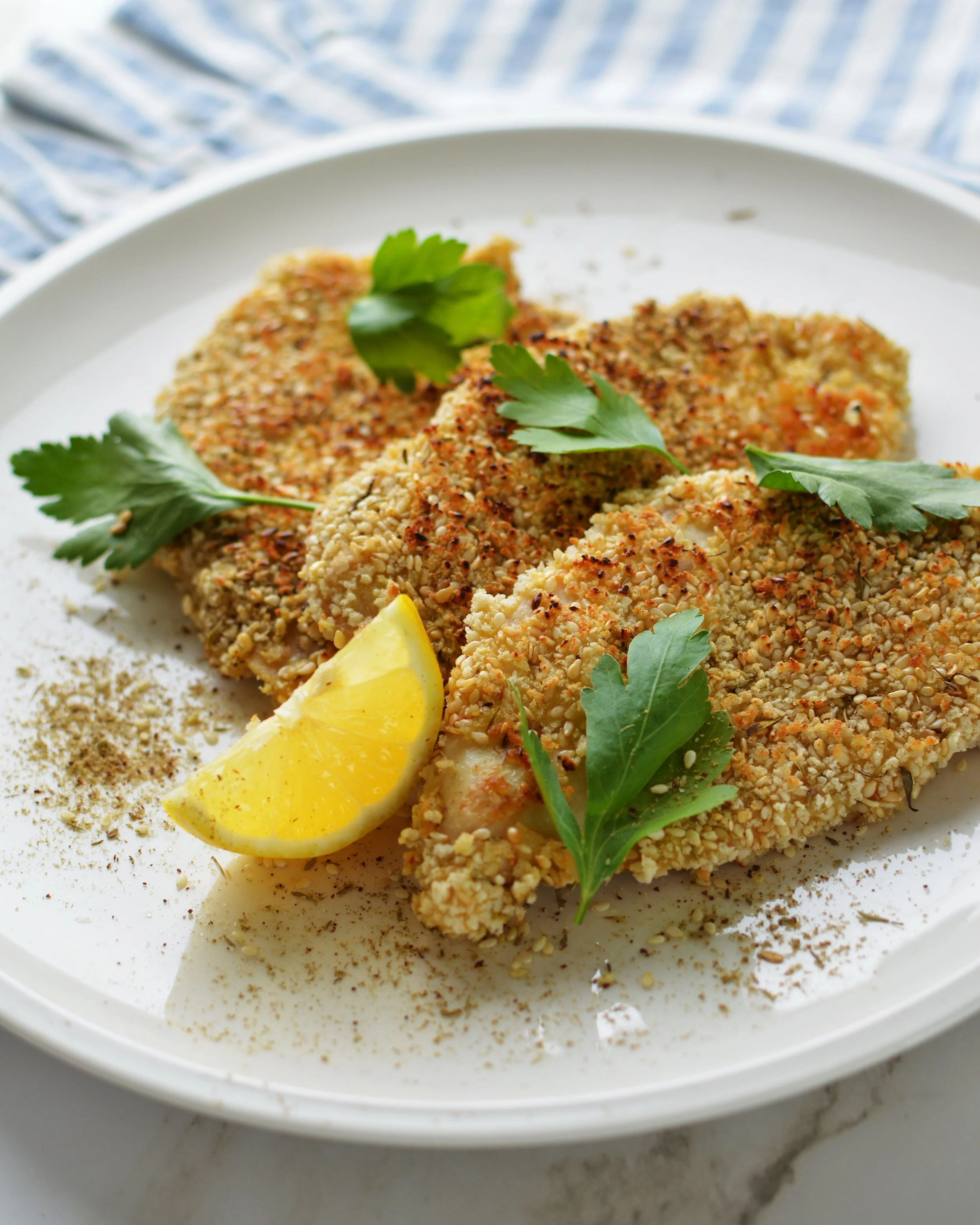 Breaded chicken cutlets are always a delicious way to serve up chicken breast. This Mediterranean version was adapted from Michael Solomonov's Za'atar Chicken from his cookbook Zahav. It's a bit lightened up and has a zing of lemon for freshness.