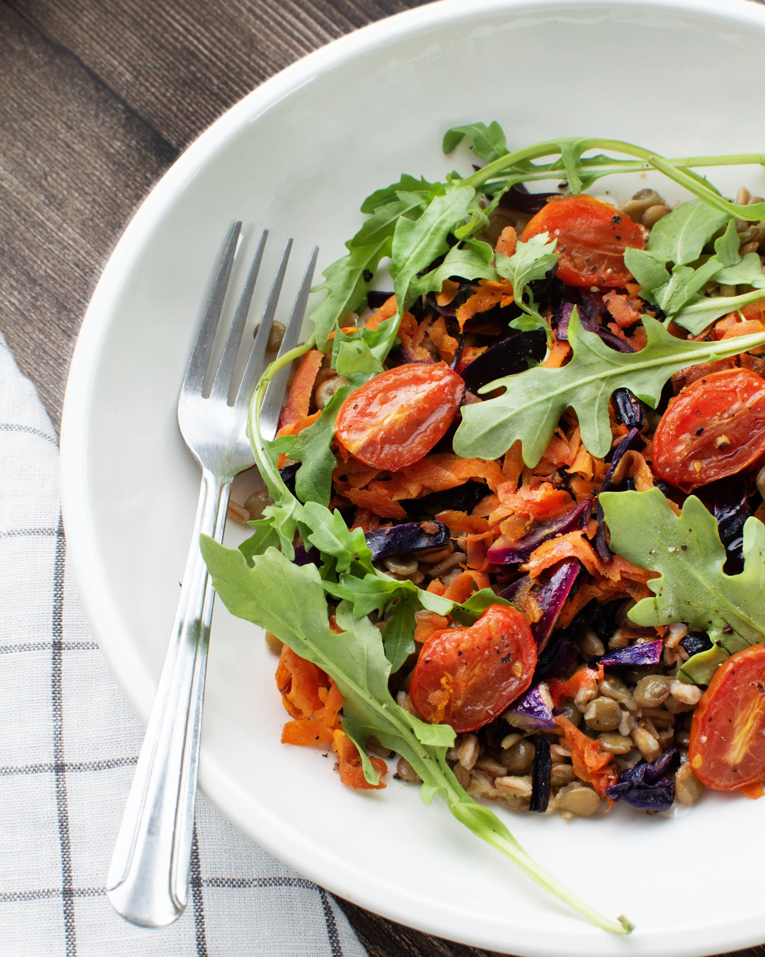 To serve, create a bowl for each person, add the lentil and faro mixture to the base of a shallow bowl, top with a few spoonfuls of carrot, cabbage and tomatoes, a handful of arugula and then a generous squeeze of lemon juice. Taste and add an additional glug of olive oil and/or salt and pepper.