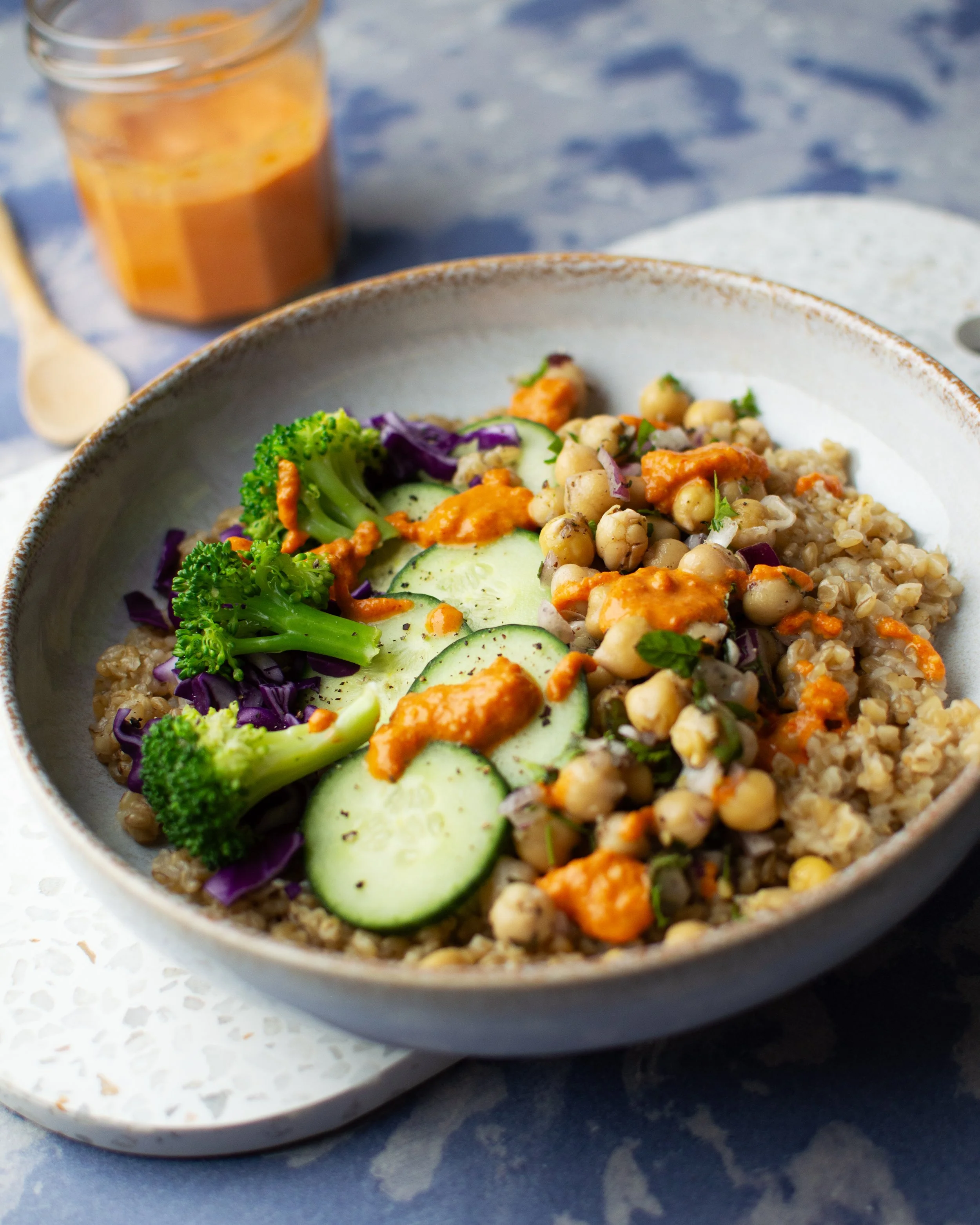 This is the ultimate meal-prep dish. Meaning the leftovers are just as good as when it was fresh. This is especially true of the herby-sumac chickpeas that taste even better the next day. What brings this bowl together is the roasted red pepper sauce, which is creamy without any dairy. If you are in a rush, you can always use a 340g jar of roasted red peppers. But trust me, roasting the peppers yourself tastes 10x better. The citric acid, or other preservative, makes the sauce taste slightly bitter, and you don’t have quite the same level of smokiness as home-roasted peppers.