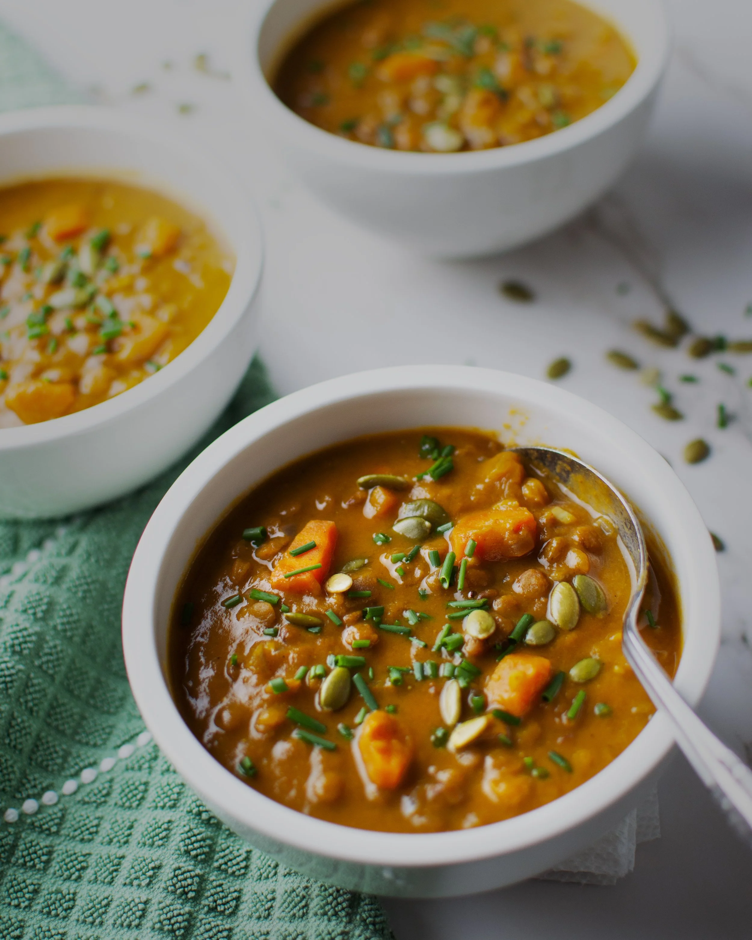 This cozy pumpkin lentil soup screams fall. Tuck into a warm bowl of this creamy vegan soup on a chilly cold night to warm you up. Packed with protein and healthy fats, it is satisfying enough to be a light dinner or a wholesome lunch.