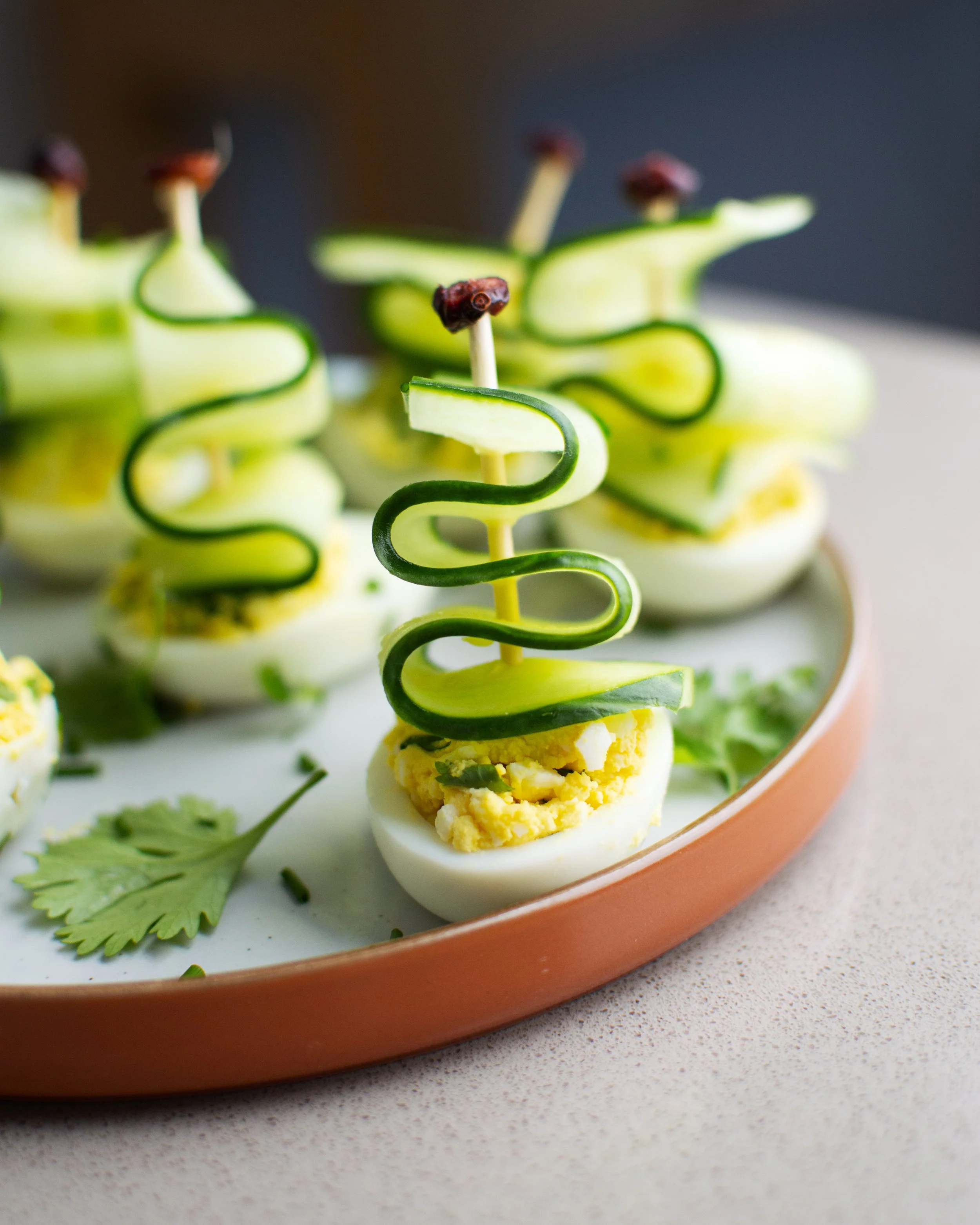 Stuff the egg whites with the egg yolk mixture. Then like an accordion fold the cucumber slice and use a toothpick to pierce through the center and pin the cucumber tree on each egg.