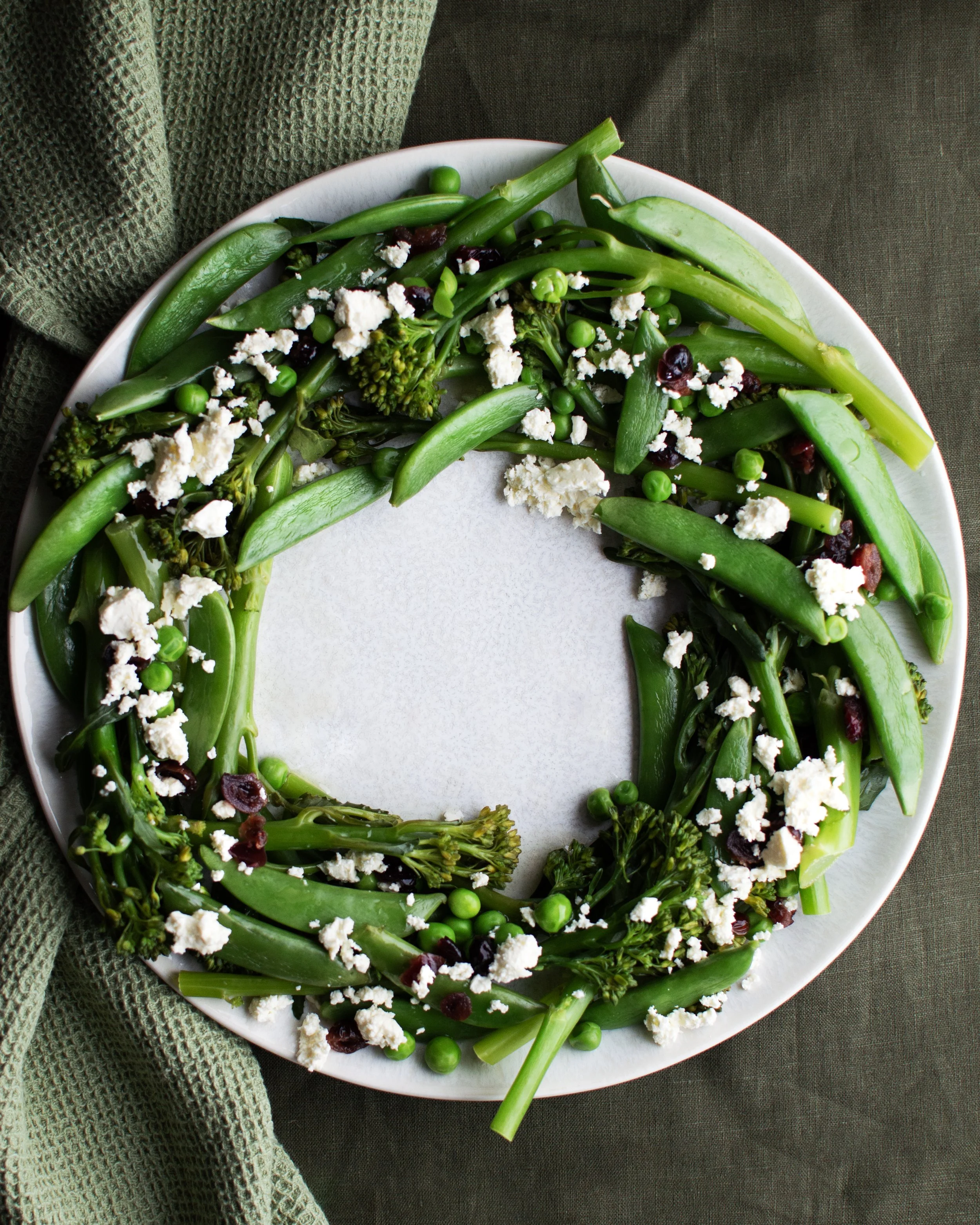 Start by placing the broccolini around the plate's circumference to create a wreath. Then add in the snap peas and peas to fill it out. Top with a drizzle of olive oil, flaky sea salt, cranberries and feta.