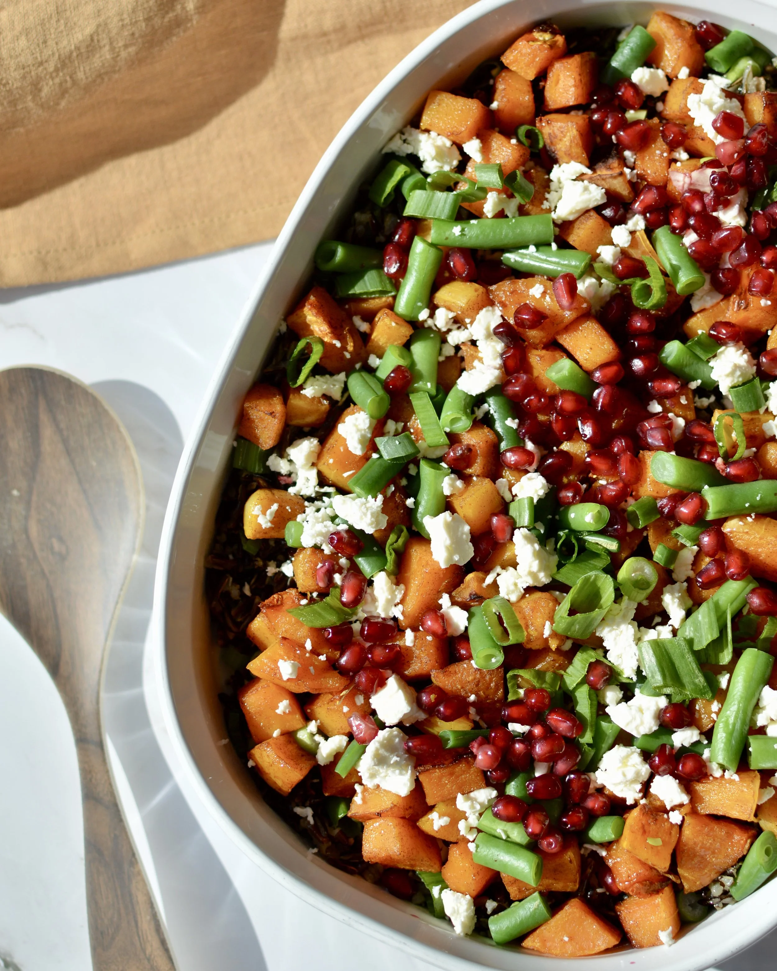 The beauty of wild rice is that it has such a nice crunch, and visually the black rice contrasts beautifully with any veggie, making it perfect for salads. The earthiness of the wild rice is nicely complemented by a zesty ginger dressing and topped with roasted butternut squash, pomegranate arils, green onions, and feta cheese. This recipe is the perfect show-stopper to bring to your next potluck. It can be prepared ahead of time without compromising texture or taste and is a feast for both the eyes and the taste buds.