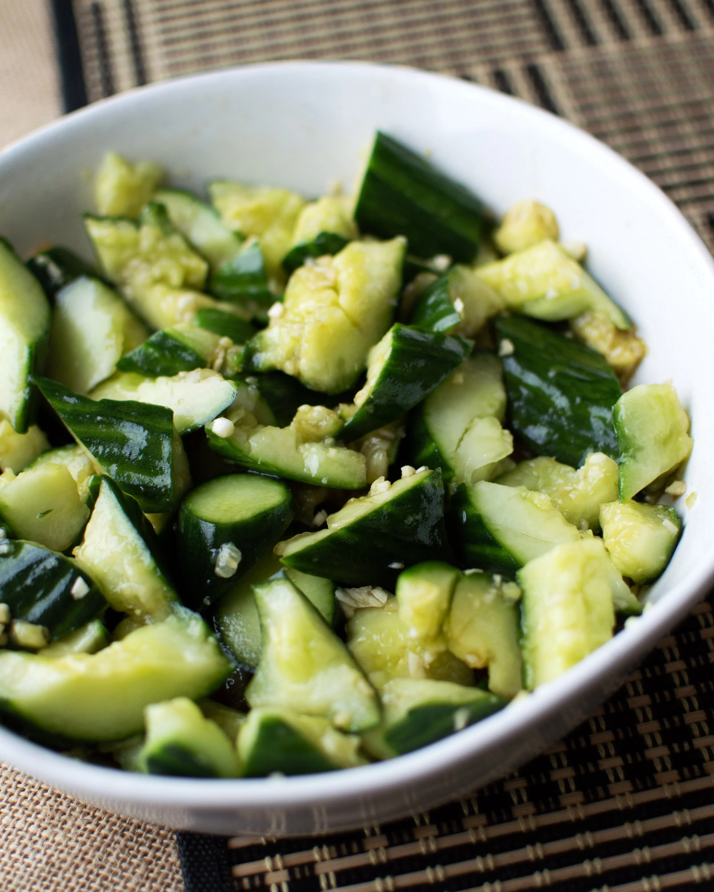 The most iconic cucumber salad is the Chinese smashed cucumber salad. It is super fresh and aromatic, and the jagged edges of the smashed cucumber soak up the dressing perfectly.