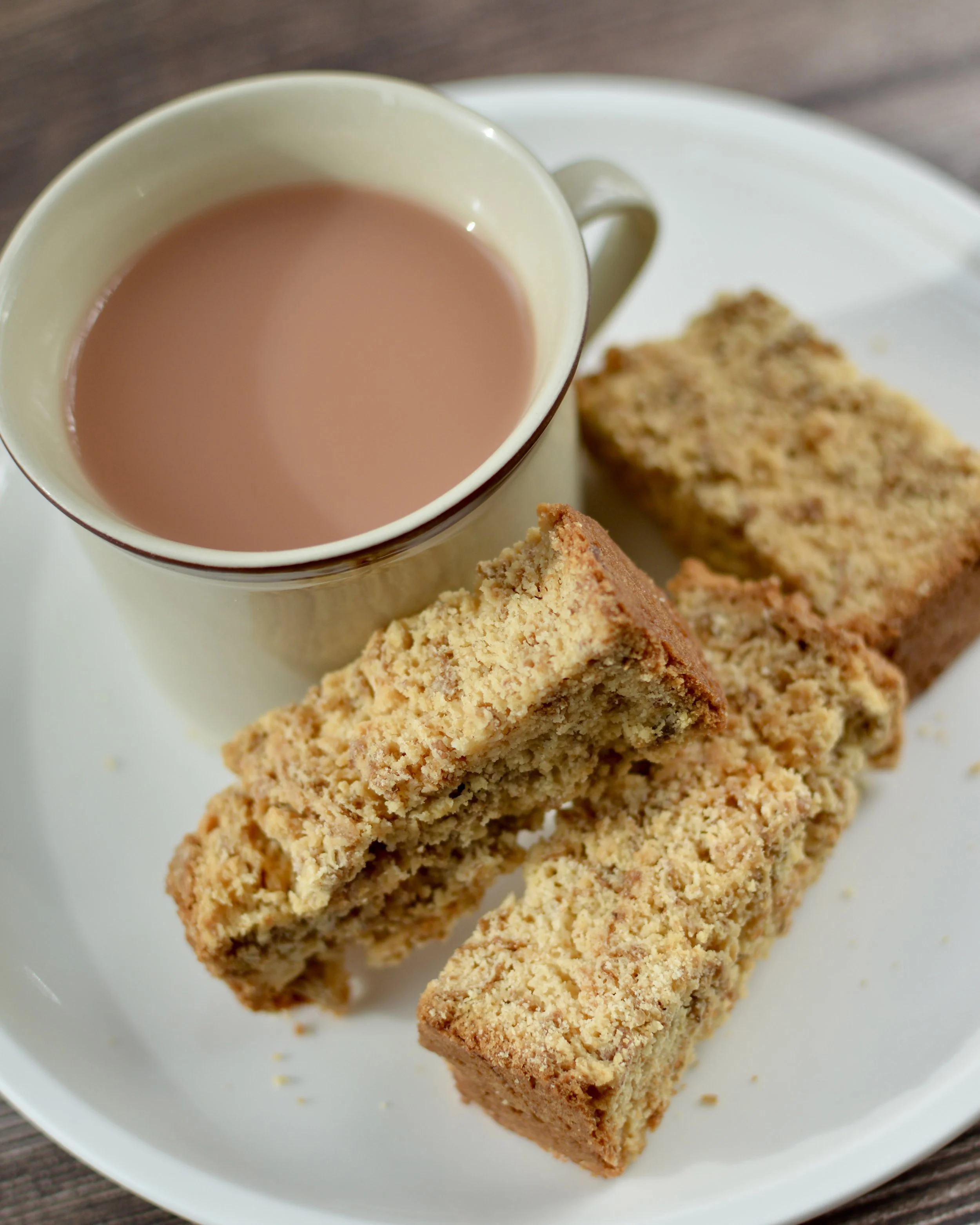 Preheat the oven to 210F. Put the cut rusks on a baking tray and bake for 4-5 hours. Flip them occasionally for even browning. They are done when they are completely dried out, just ensure not to overcook them as they get harder and harder as they dry out. Enjoy the rusks dipped in tea or coffee.