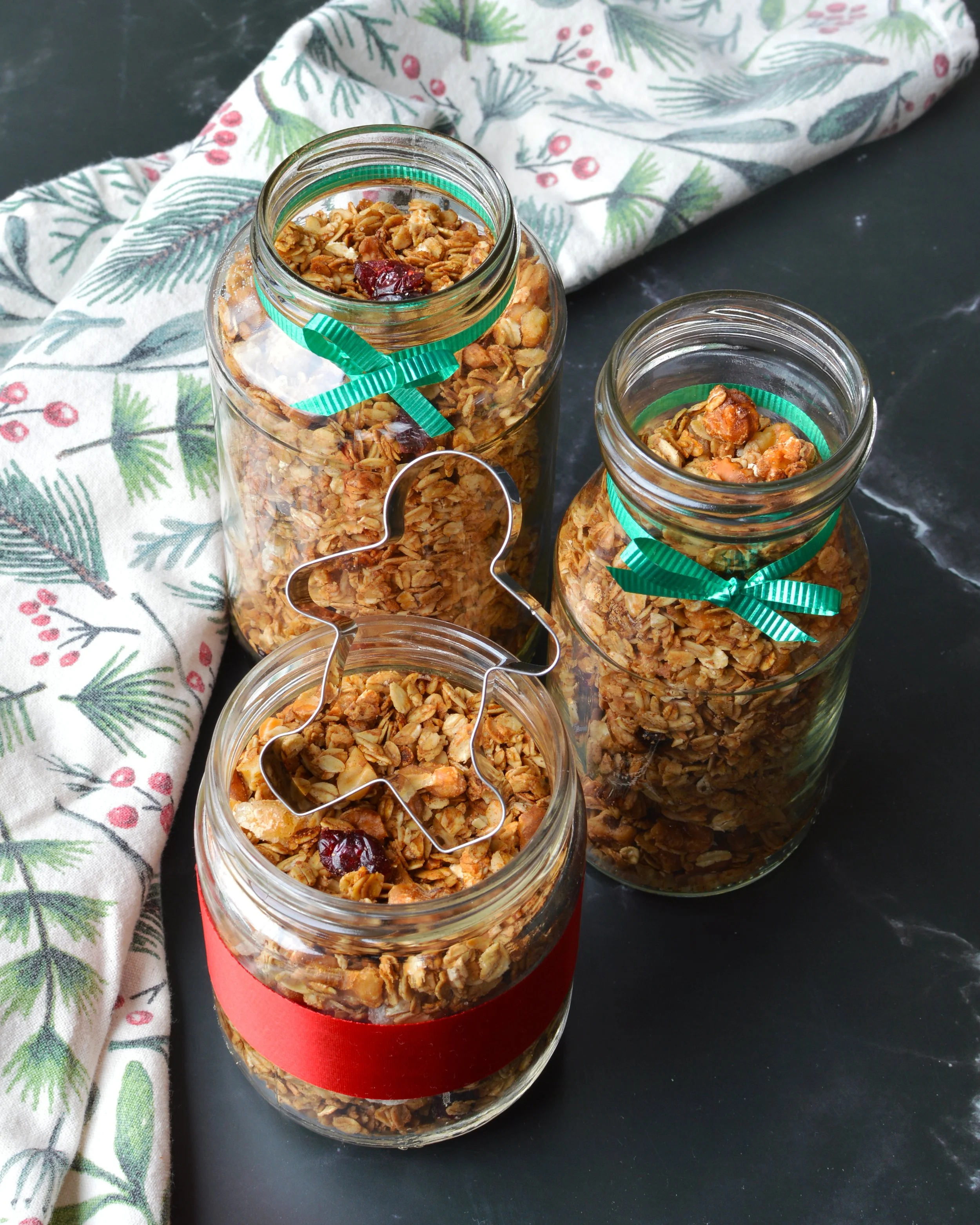 A festive granola with molasses and all the delicious spices of gingerbread! Delicious to eat by the handfuls or sprinkled on yogurt or fruit for a healthy dessert for the holiday season.